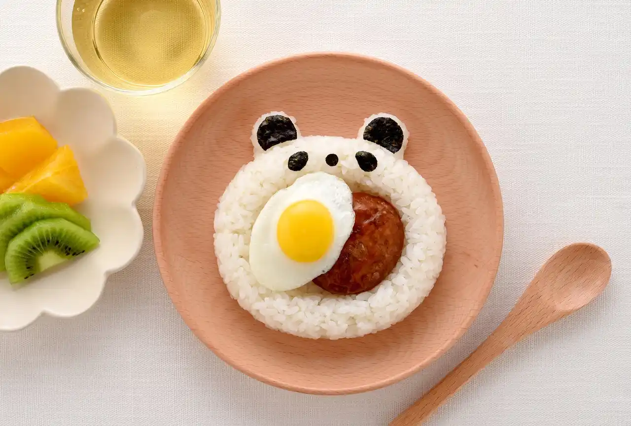 おかずを盛りつけるだけでいつものご飯がかわいく大変身します。白ご飯だけでなく、ご飯自体に麺つゆやケチャップなどで色付けするのもオススメです。また、海苔パーツを組み合わせれば、クマだけでなくパンダを作ることもできます。 |