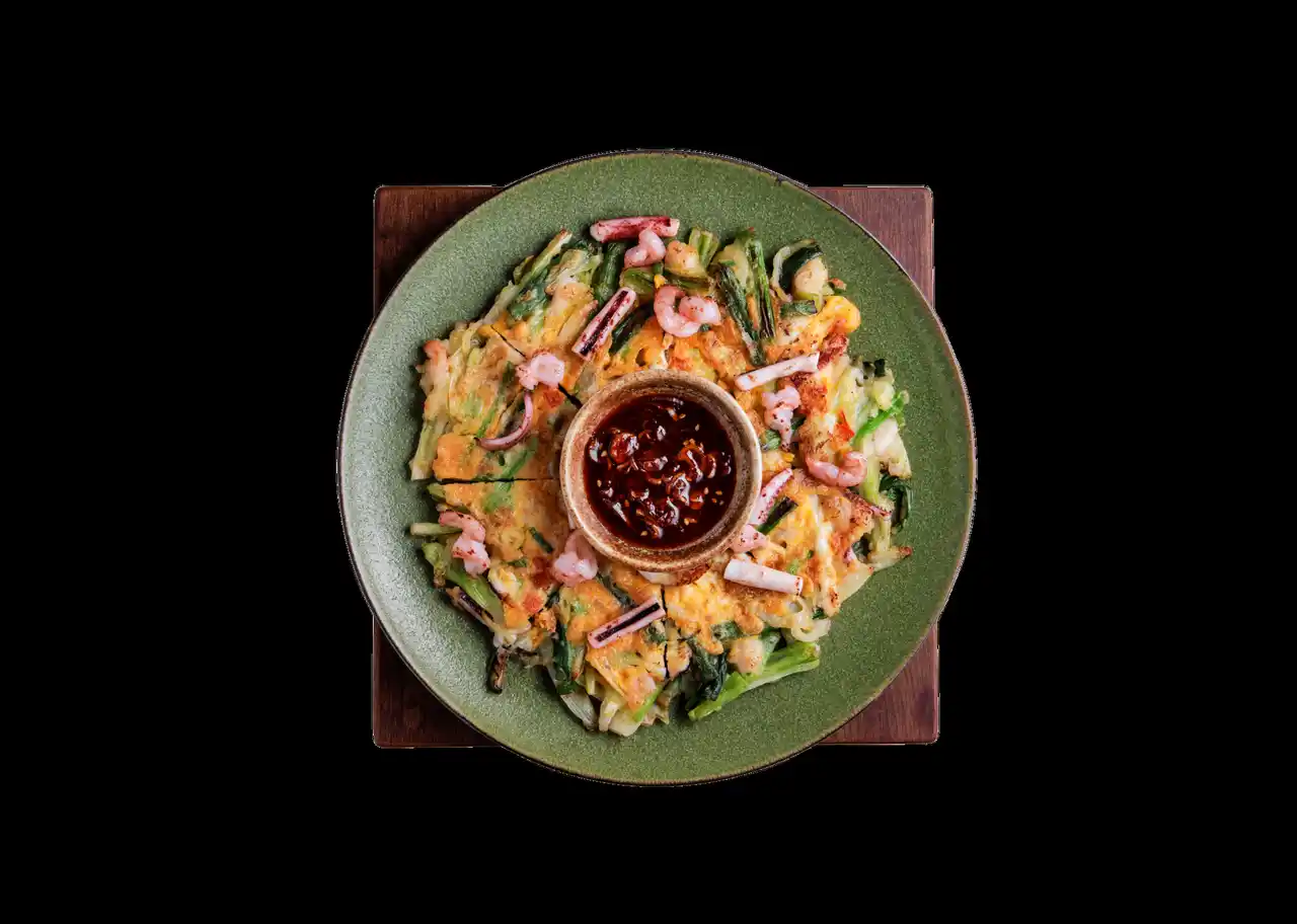 たっぷり海鮮をのせたサクサクのチヂミ。 |