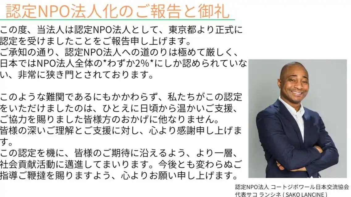 認定NPO法人 コートジボワール日本交流協会 (本社:東京都千代田区、代表理事:サコ ランシネ ( SAKO LANCINE )、以下、当協会) は、2025年11月18日付で東京都より承認を受け、認定特定非営利活動法人となりました。 |
