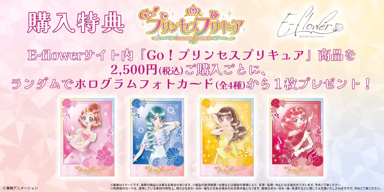 E-flower通販サイト内で『Go!プリンセスプリキュア』商品を2,500円(税込)ご購入ごとに、ランダムで「ホログラムフォトカード(全4種)」から1枚プレゼント。 |