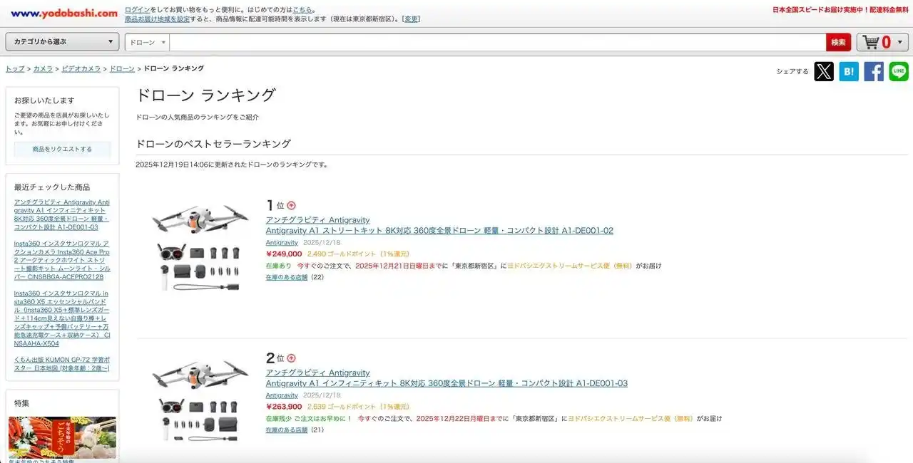 その中で、Antigravity A1は発売からわずか3時間以内に、国内大手家電量販店のドローン販売ランキングで第1位を獲得し、24時間以内にはトップ2を独占したことが明かされました。 |