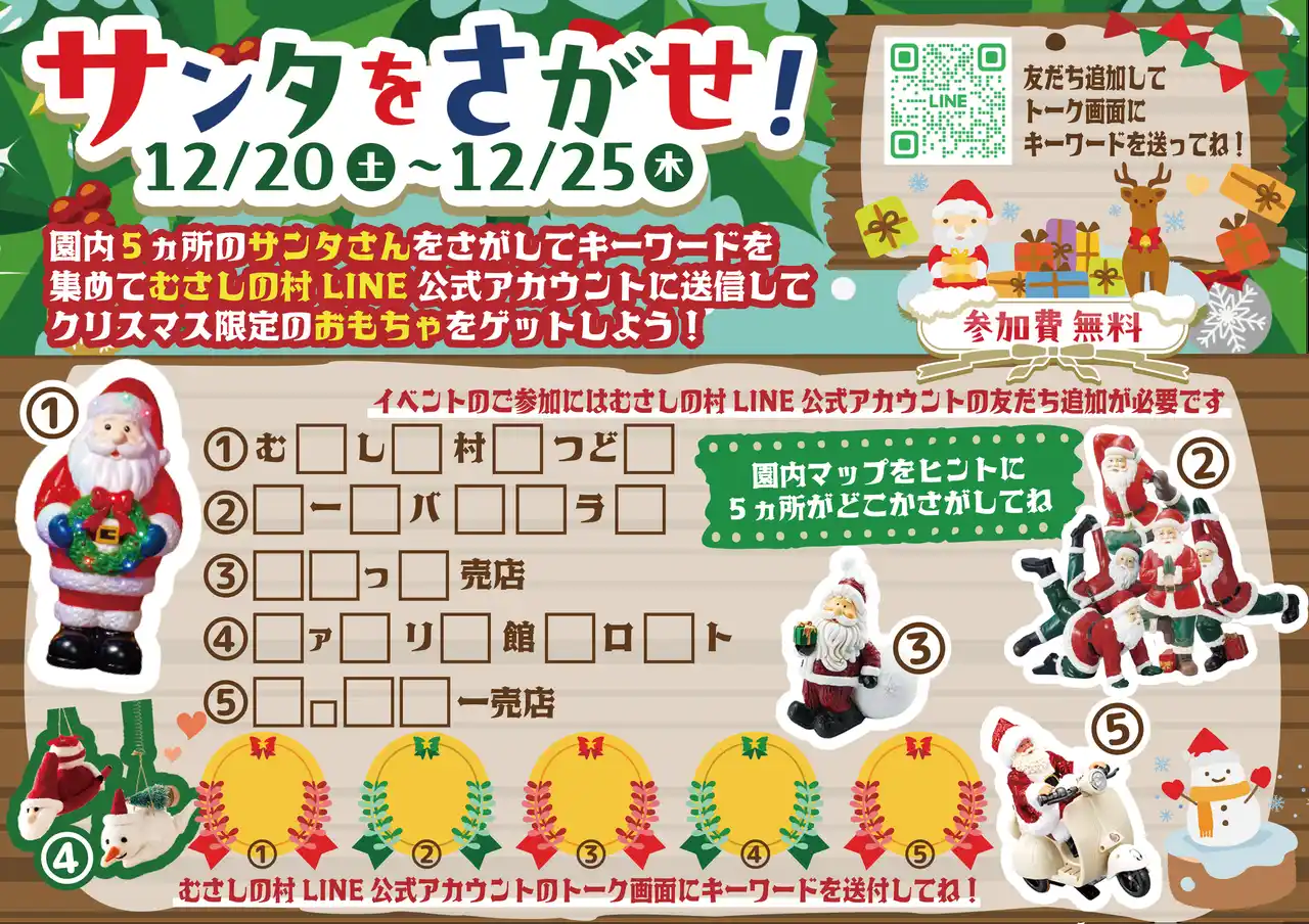 〈内容〉園内に隠れている5種類のサンタクロースを探そう!キーワードを集めてむさしの村LINE公式アカウントに送信すると素敵なクリスマスおもちゃのプレゼントがもらえるよ! |