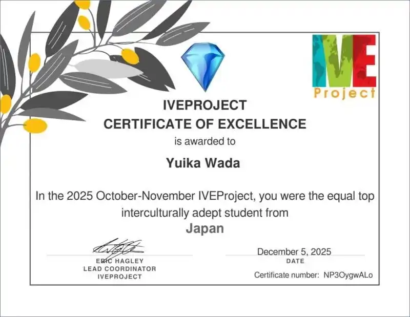 今年度は、33か国・50大学から計2,953人の学生がIVEプロジェクトに参加。和田さんはその中で、優秀学生トップ20に入り、「Certificate of Excellence(優秀賞)」を受賞しました。これは、本学がこのプログラムに参加して以来、初めてのことです。 |