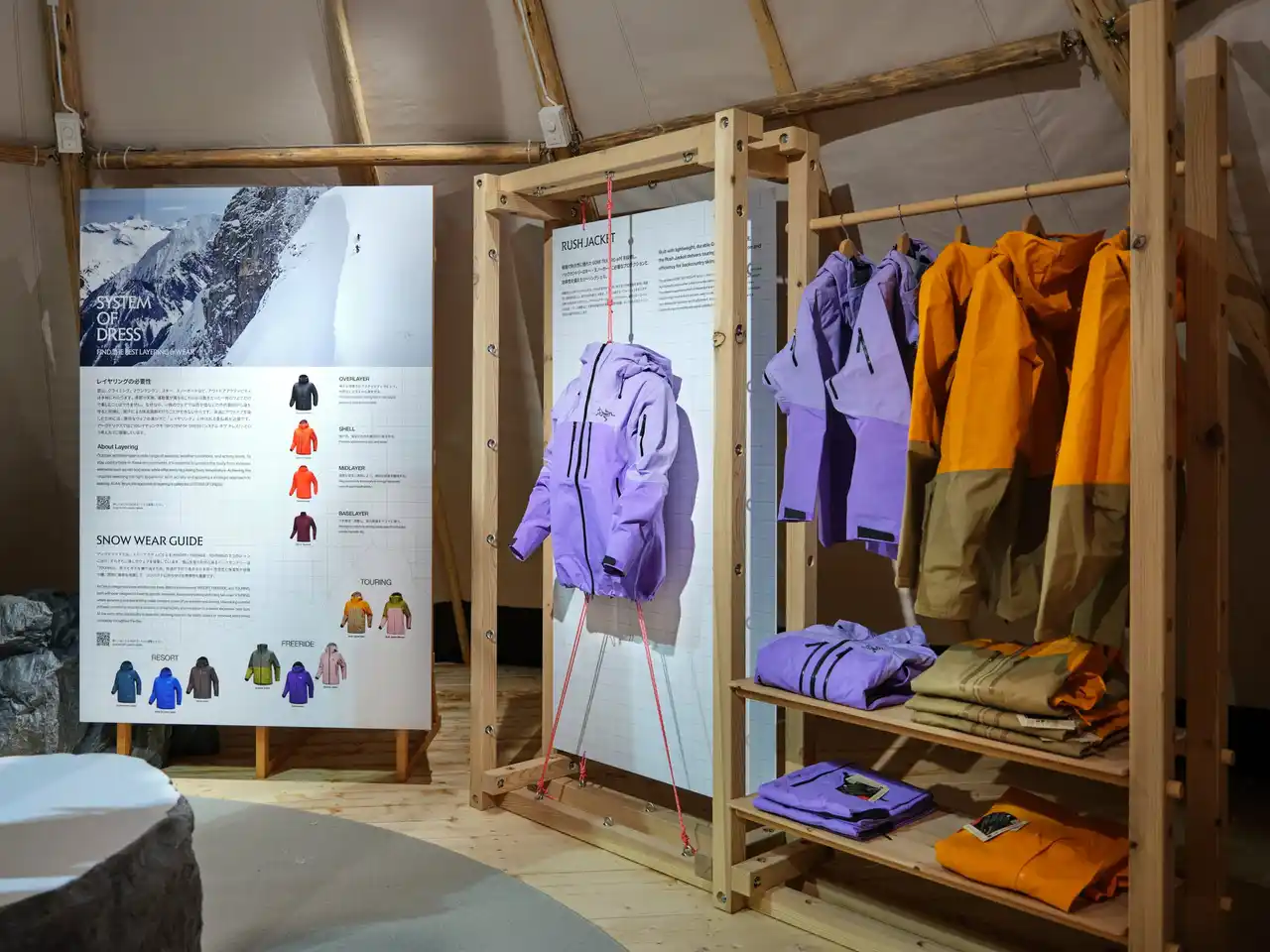 バックカントリー・ツーリングのためにデザインされたRUSH(ラッシュ)と、ミッドレイヤーとなるATOM(アトム)やPROTON(プロトン)など、最新テクノロジーを搭載したプロダクトを実際に試していただくことができる体験型展示。アークテリクスのレイヤリングシステム「System of Dress(システム オブ ドレス)」を紐解く展示コンテンツも展開。バックカントリーに向かう為の最適なレイヤリング・システムを体感いただくことができます。アークテリクス主催のバックカントリーツアーの参加者は実際にフィールドでプロダクトテストをいただくことができます。 |