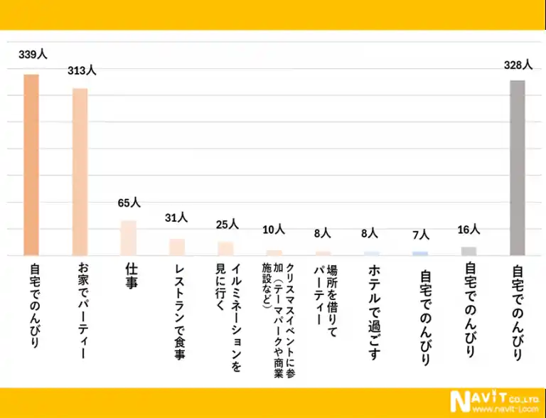 | クリスマスの予定についてのアンケートも複数回答にていただきました。最も多かったのが「自宅でのんびり」で339人、そして「お家でパーティー」が313人と、自宅で過ごす人が多いことが分かる結果となりました。 | |||