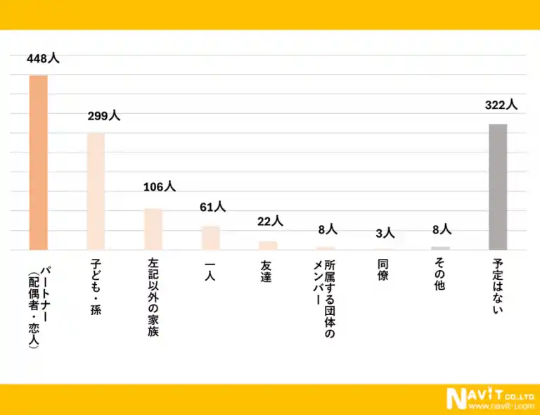 | クリスマスを共に過ごす人についてのアンケートです。こちらも複数回答でいただきました。一番多かったのは「パートナー(配偶者・恋人)」で448人、次に多かったのは「子ども・孫」で299人、3番目が「左記以外の家族」で106人という結果になりました。家族で過ごすという方がかなりの割合を占めることが分かります。 | |||