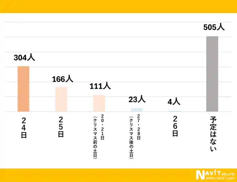 | クリスマスのお祝いをするタイミングについてのアンケートを複数回答可で実施しました。結果、お祝いするひとと人とお祝いの予定がない人でおおよそ半々で、お祝いをする人の中ではクリスマスイブである「24日」が最も多い304人という結果になっています。 | |||