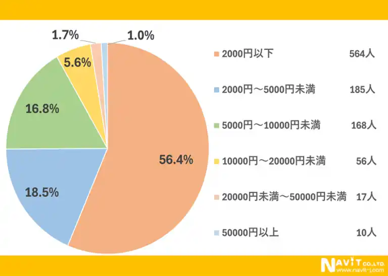 | クリスマスの楽しみであるプレゼントの予算についてのアンケートです。最も多かった回答は「2000円以下」で56.4%。続いて「2000円~5000円」が18.5%、3番目が「5000円~10000円」で16.8%という結果になりました。費用を抑えつつ、いかに相手が喜んでくれるものをあげられるかがキモとなりそうです。 | |||