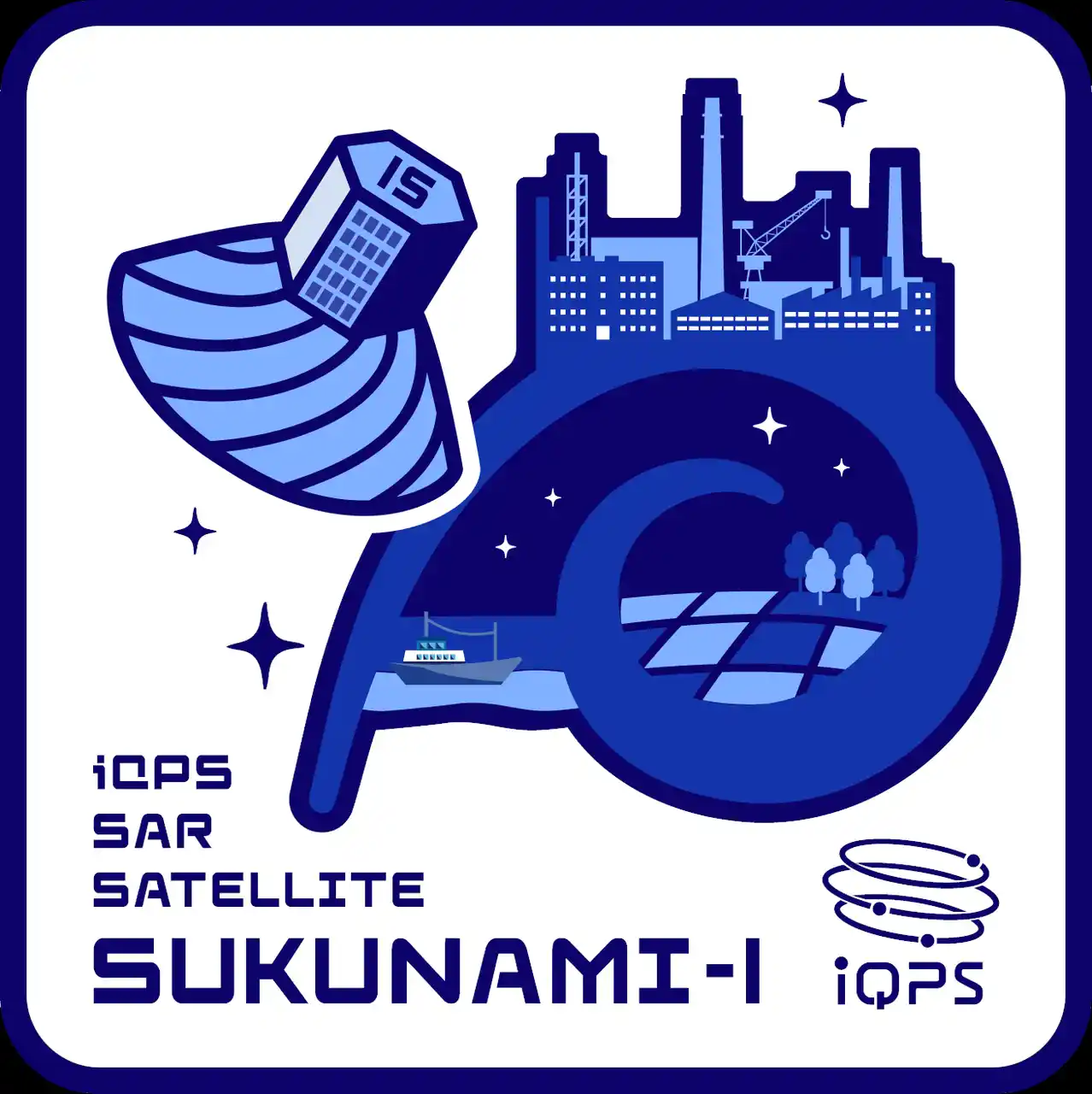 ミッションマーク:QPS研究所のカンパニーカラーであるブルーを基調とし、愛称のスクナミをイメージする「国造り」の中でも技術を表す漁業や農業、工業地帯を表しています。また、共に国造りを行ったことから、ヤチホコのミッションマークとリンクしたデザインになっています。クシナダやヤチホコと同じく、傾斜軌道では経済活動が活発な大型都市圏が観測域に多く入ることになります。また、一目でどの衛星のマークか分かるように通算した衛星の数の数字を衛星の底部に入れています。 |