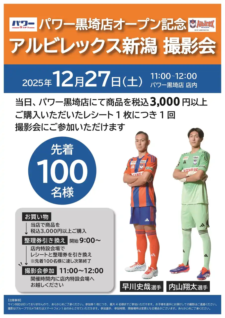 | このたび、12月27日(土)に、先日オープンしたコメリパワー黒埼店のオープンを記念して、撮影会イベントを開催いたします。当日は、早川史哉選手・内山翔太選手が登場し、イベントを盛り上げます。 | |||||||