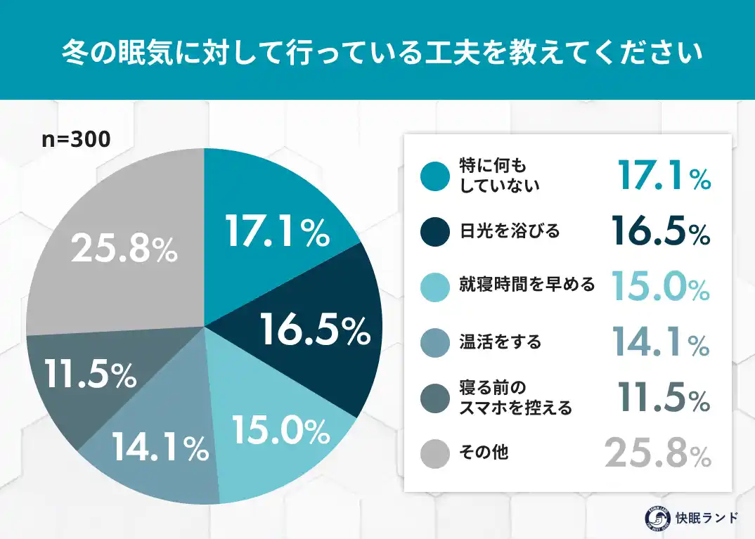 → 約8割が何らかの対策を講じている一方で、最多は「特に何もしていない」という結果となりました。対策内容も分散しており、冬の眠気に対する明確な“正解”が共有されていない現状がうかがえます。 |