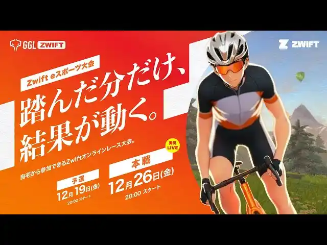 ・大会名: GGL ZWIFT ・予選: 2025年12月19日(金)20:00~ ・本戦: 2025年12月26日(金)20:00~ ・参加費: 無料 ・参加条件: Zwiftアカウント、スマートトレーナー等、Discordへの参加 ※ ・運営 : GGL運営委員会、株式会社RATEL ・参加規約:https://x.gd/6DpEt ・配信URL : https://www.youtube.com/watch?v=GAlKCL8CnPg |