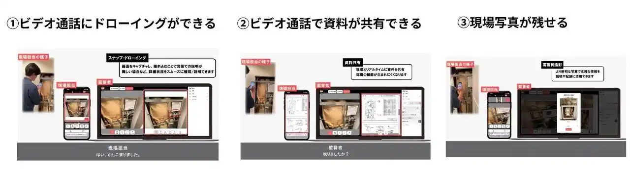 1.スナップ・ドローイング:画面をキャプチャし、描き込むことで詳細状況をスムーズに確認/説明ができます。2.資料共有:現場とリアルタイムに資料が共有でき、認識の齟齬が生まれにくくなります。3.高画質撮影:より鮮明な写真で正確な情報を説明や記録に活用できます。 |