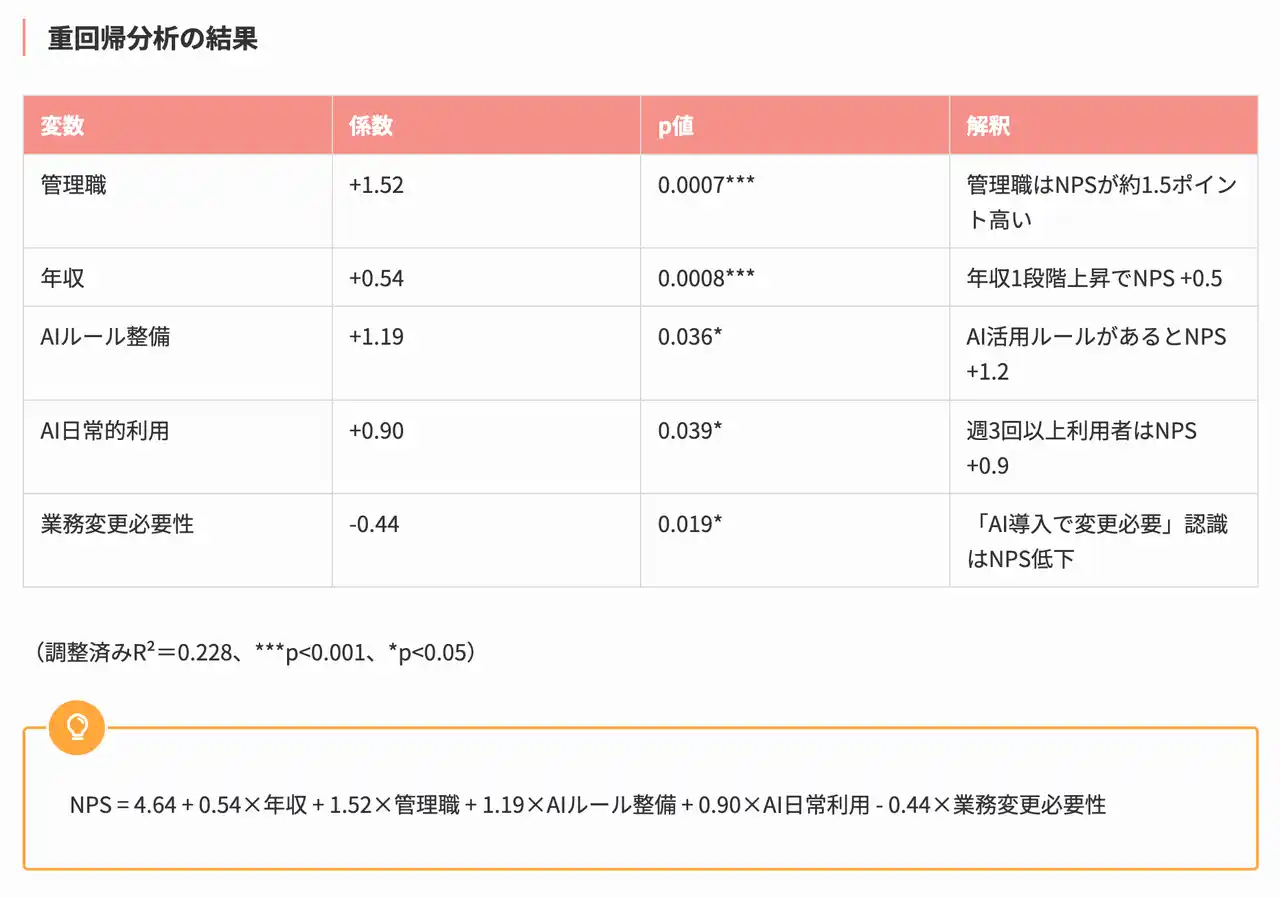 NPS(Net Promoter Score:職場を知人に勧めたいかを0~10点で評価)を従属変数とした重回帰分析を実施した結果、AI活用ルールの整備が従業員満足度に与える影響は年収アップの約2.2倍であることが判明しました。 |