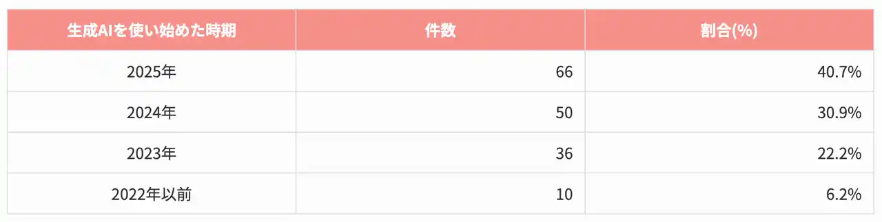 生成AIを使ったことがある回答者の40.7%は2025年から使い始めています。2025年に入ってから急速に利用者が増加していることがわかります。 |