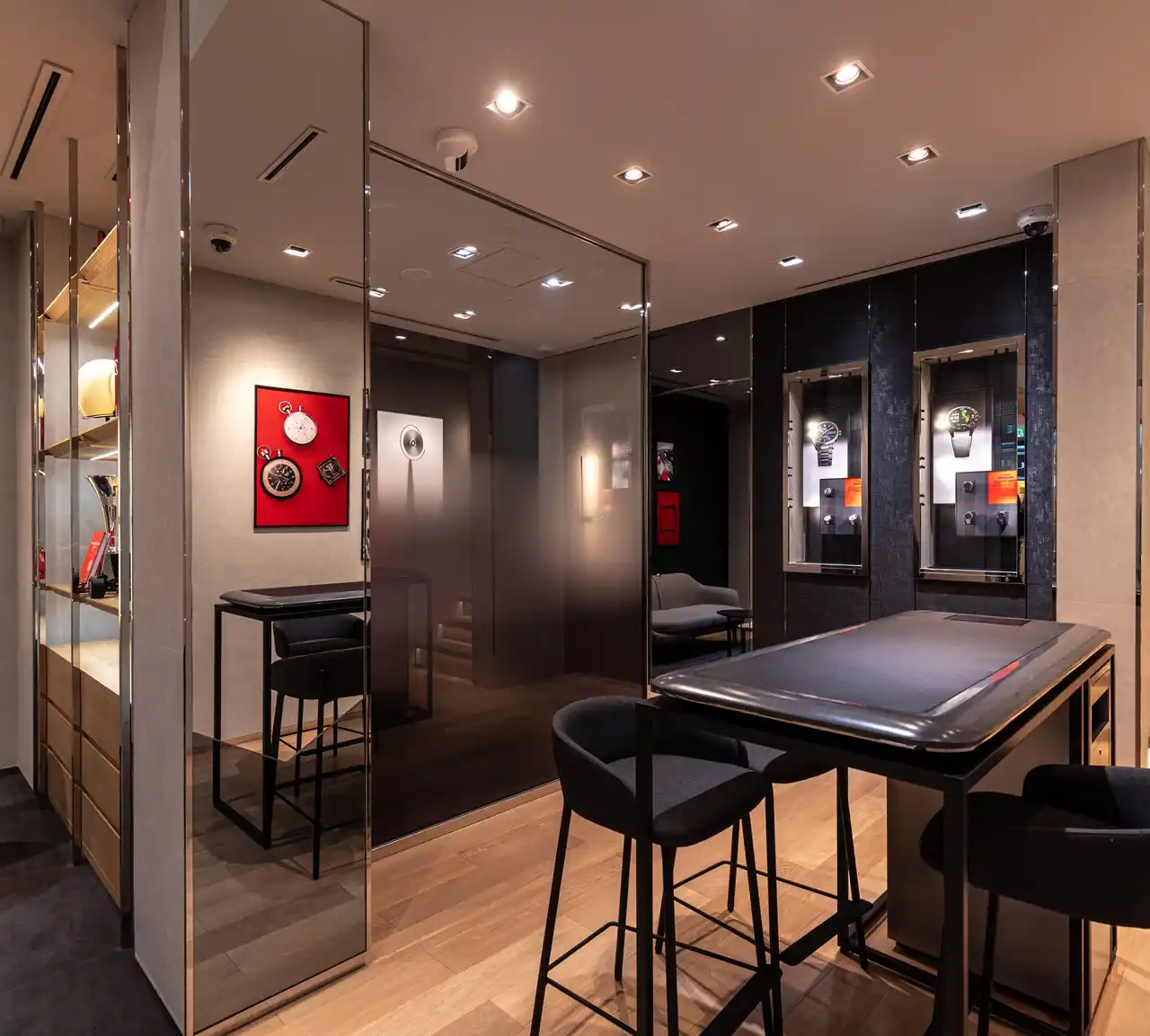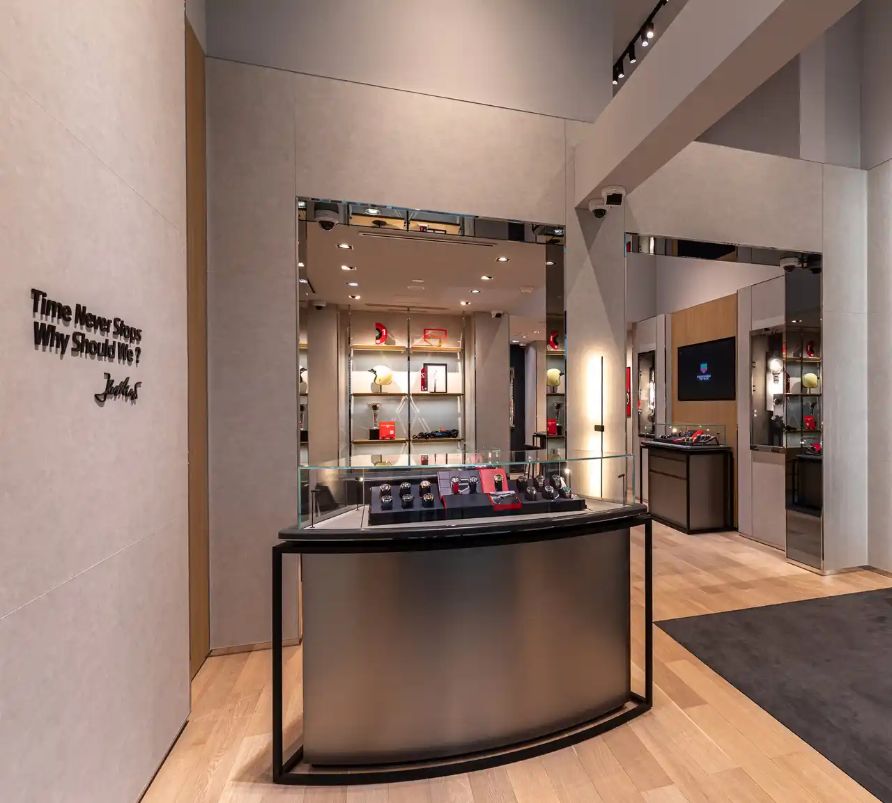 | 店内は、力強くタイムレスなブラックに加え、温かみのあるグレーやニュートラルカラーで構成され、新たな調和を生み出すことで、タイムピースをより引き立てています。また、洗練されつつも温かみのある空間設計により、タグ・ホイヤーの現代的な力強さと優雅さを反映しつつ、お客様に心地よくお過ごしいただける空間を提供します。 | |||||||||