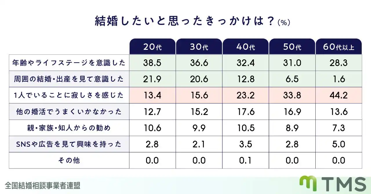 年代別での分析では、「年齢やライフステージを意識した」「周囲の結婚・出産を見て意識した」といった理由は、若年層で特に高く、年齢が上がるにつれて減少する傾向が見られました。一方で、「1人でいることの寂しさ」は年代が上がるごとに増加する結果となり、孤独感が結婚を後押しする重要な要素であることが示されました。 |