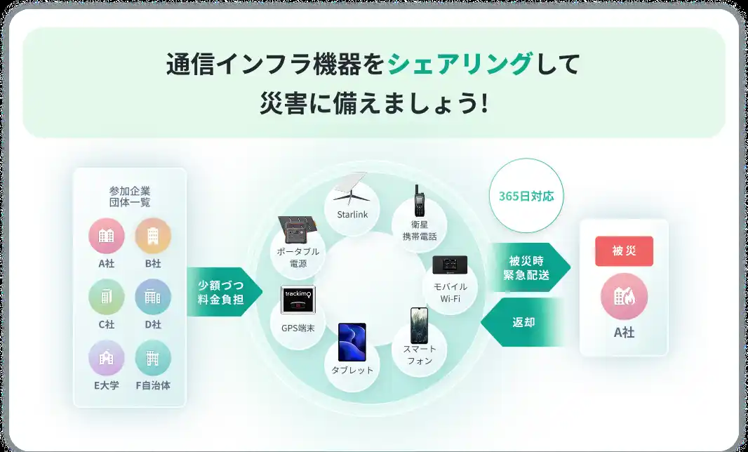全国の契約者で通信インフラ機器をシェアリングする形式で、被災した場合に緊急配送にてお届けし、利用いただくというサービス形態です。 |