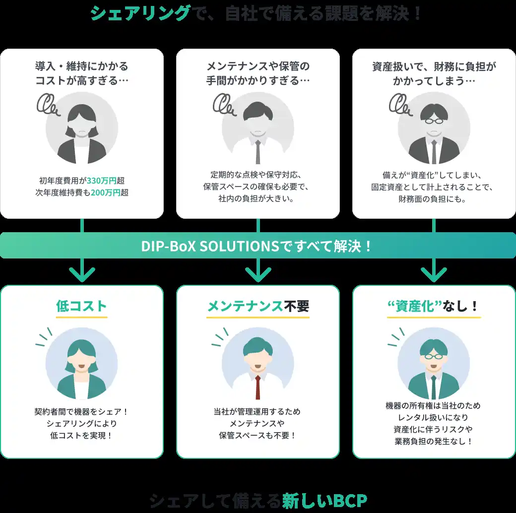 使える状態をキープするには月額費用がかかるだけでなく、OSアップデートや充電管理など定期的なメンテナンスが必要です。また当然備蓄保管するスペースも必要ですが、DIP-BoXはメンテナンスされたものが提供されるシェアリングなのでどちらも不要! |