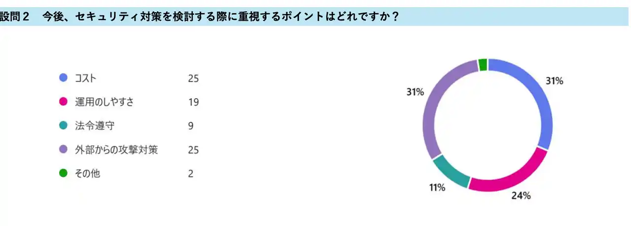 今後セキュリティ対策を検討する際に重視するポイントとしては、「コスト」と「外部からの攻撃対策」が同率で最も多く挙げられました 。 |