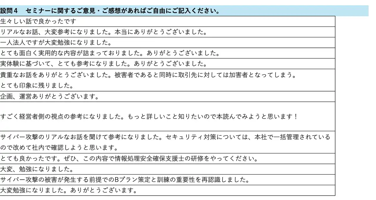 参加者からのコメントには、「サイバー攻撃の被害が発生する前提でのBCPプラン策定と訓練の重要性を再認識しました」 、「被害者であると同時に取引先に対しては加害者となってしまう」 といった声があり、今回の講演が、単なる技術的な対策に留まらない、事業継続計画(BCP)やサプライチェーン全体におけるリスクの再認識を促す機会となったことが示唆されます。 |