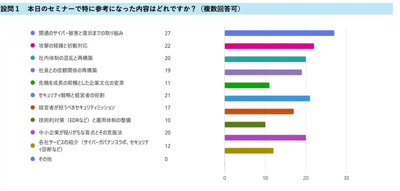 また、関通の復旧を支援した株式会社CISOの那須慎二氏による、「中小企業が陥りがちな盲点とその克服法」についても20件の回答があり、実践的な対策への関心の高さが伺えました 。 |