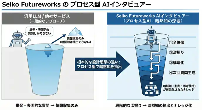Seiko Futureworks のAIインタビュアーは、従来のヒアリングでは難しかった深層の知識を有識者から抽出することで、組織の競争力を高めるための本質的な知見を蓄積するインタビュー設計を実現しています。 |