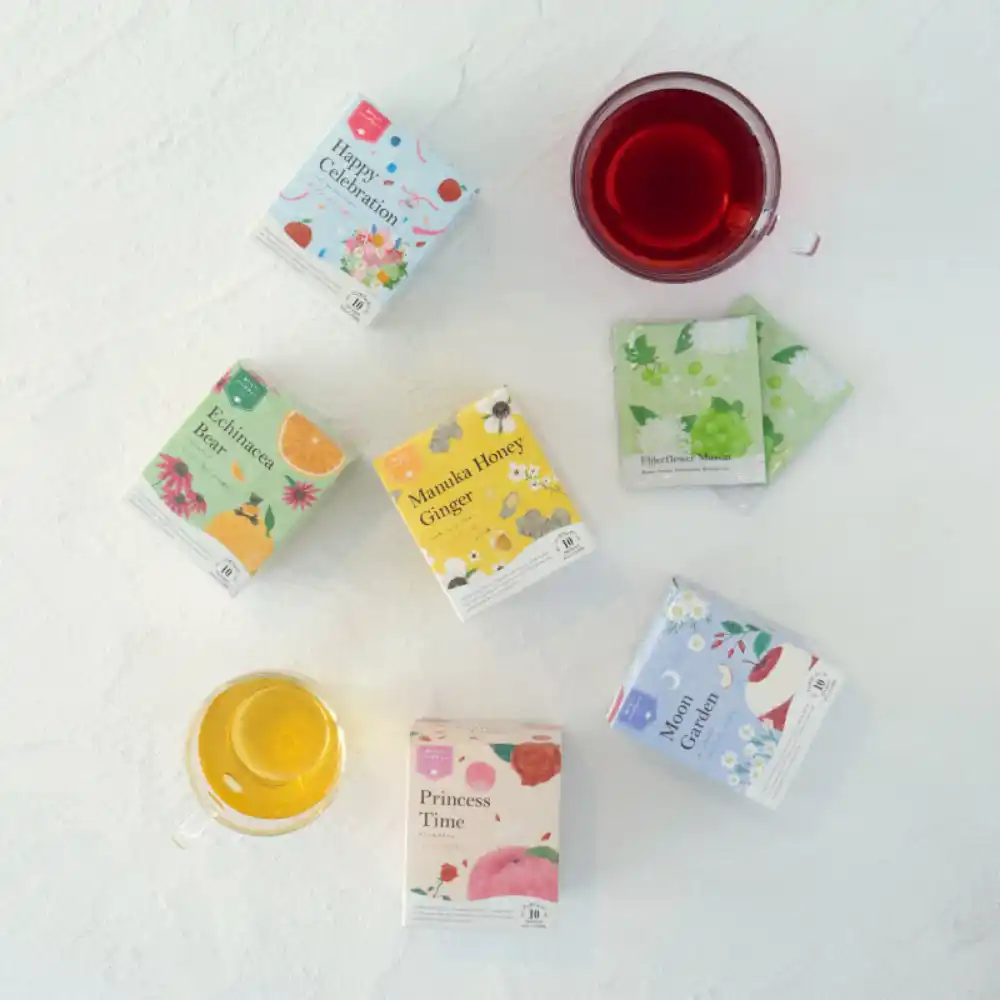 厳選ハーブとカラフルなフルーツが出会い、おいしく心おどるハーブティーができました。 |