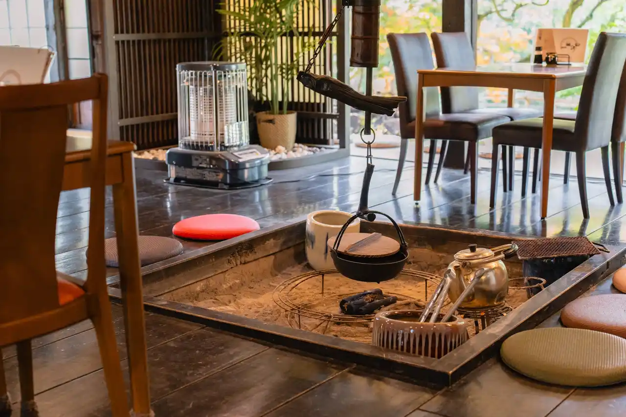自然薯茶屋は、白川郷から移築した合掌造りの古民家。 梁のある天井、木の香り、やわらかな灯り、囲炉裏の火--どこか昔を思い出す、なつかしい空気が流れています。 田舎に“帰ってきたような時間”をお届けします。 |