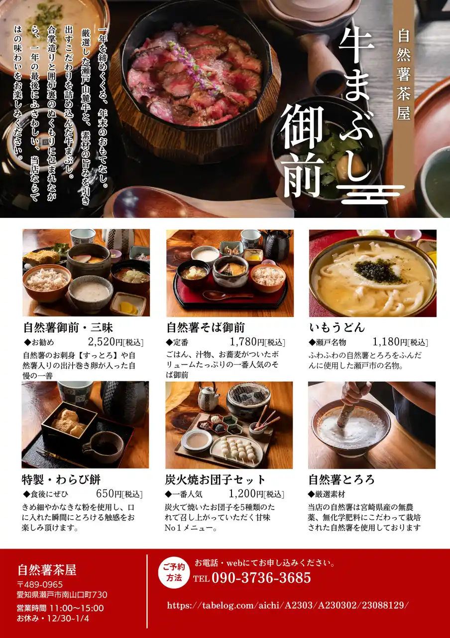 | 年の瀬を迎え、帰省や仕事納め、家族が集まる機会が増えるこの時期。愛知県瀬戸市の自然薯茶屋では、一年を締めくくる特別なおもてなしとして、岩屋堂で好評を博した「牛まぶし」を年末限定で販売いたします。 |