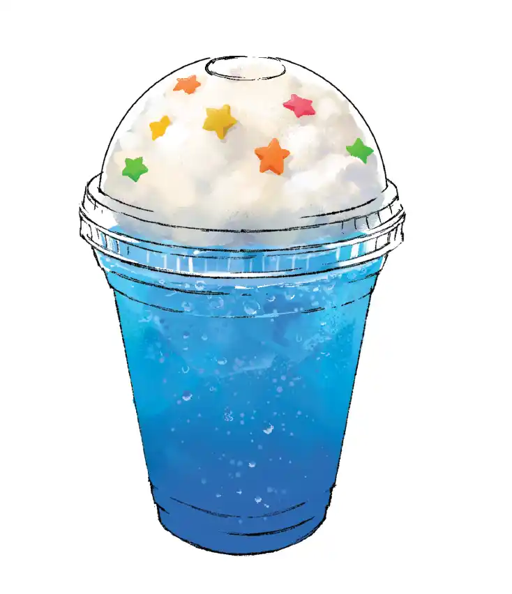 ・ナニカのオーロラソーダ 価格:900円(税込)ブルーキュラソーシロップ/スプライト/炭酸水/オーロラパウダー入りコットンキャンディー/砂糖菓子 |