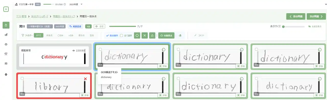 高精度なAI採点: 独自の生成AIモデルにより、記号問題だけでなく、従来のOCRでは困難だった縦書きや英数字、記述式・長文問題も高精度で認識・自動採点します。 |