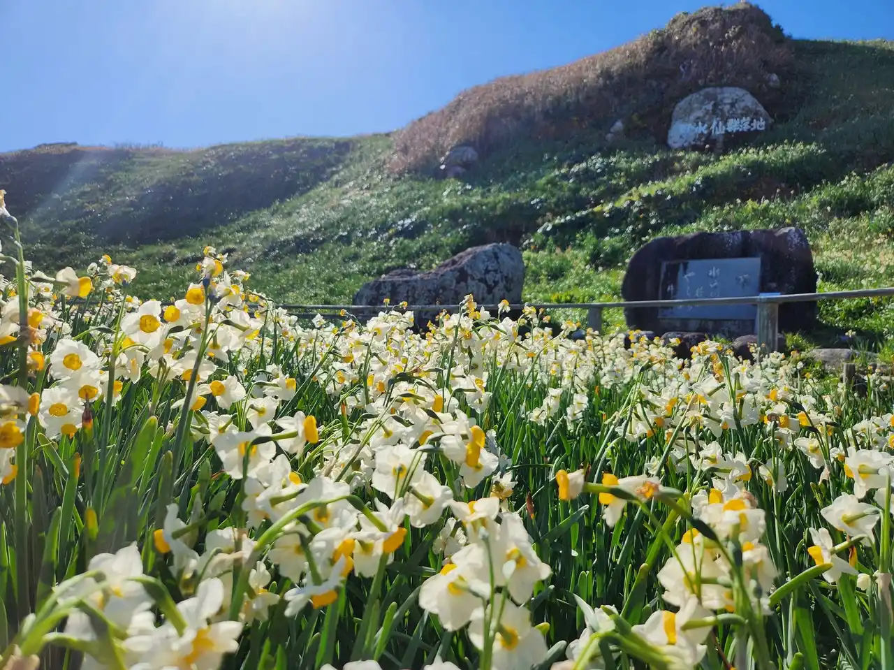爪木崎では毎冬、300万本もの野水仙が甘い香りを漂わせながら咲き誇り、白い花々と碧い海が織り成す“冬の絶景”を楽しむことができます。会場では、ジオガイドによる自然散策ツアーや地元名物「いけんだ煮味噌(漁師鍋)」の振る舞い、スタンプラリーなど、訪れる人々を温かく迎える企画が多数開催され、毎年多くの観光客が訪れる伊豆の冬の風物詩となっています。 |