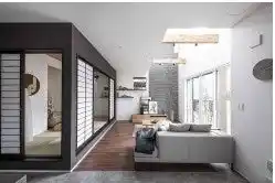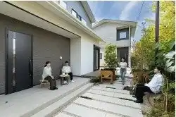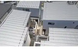 隣接する2つの区画を一つの敷地として捉え、「中間領域を活用した、高いプライバシーを持つ住まい」を創造した住宅です。住戸間の中間領域を巧みに組み込むことで、道路からの視線を遮断し、快適な居住空間を確保しました。室内のプライバシーを守りつつも、外部とのつながりを保ち、カーテンを閉めずに自然光と新鮮な空気を確保できます。 |