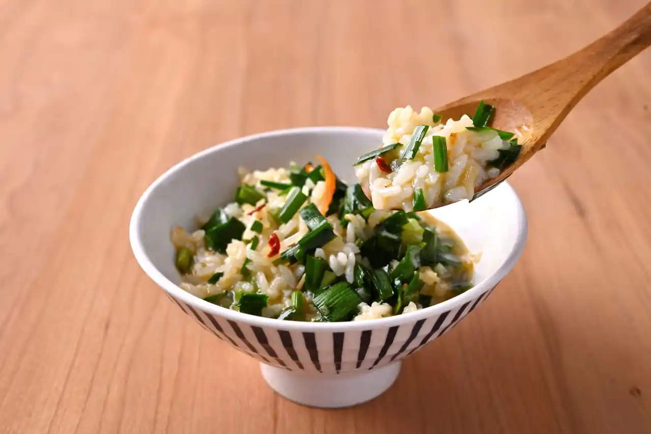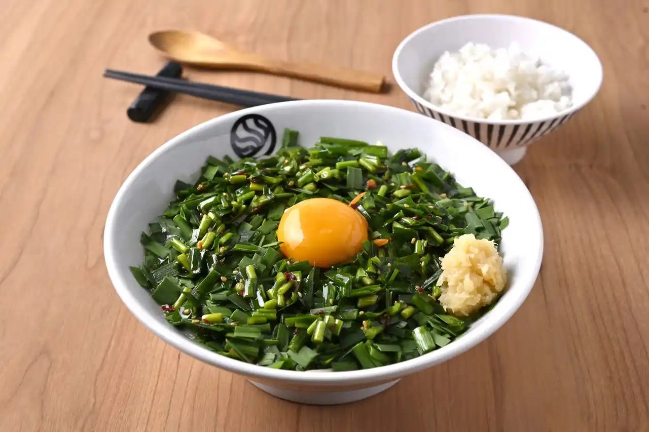 濃厚な鶏豚骨スープに、香味ごま油をまとった旨ニラとシャキシャキ生ニラを半束分たっぷりとトッピング。中央には卵黄、サイドには刻みにんにくを添えたパンチの効いた一杯です。卵黄を崩して混ぜれば、香り・旨味・コクが最高潮に!最後は、旨味が凝縮したスープに"禁断の〆めし"を入れて「ニラタマニンニクおじや」(写真左)にして、一食で二度美味しい、多幸感MAXの一杯を楽しめます。 |