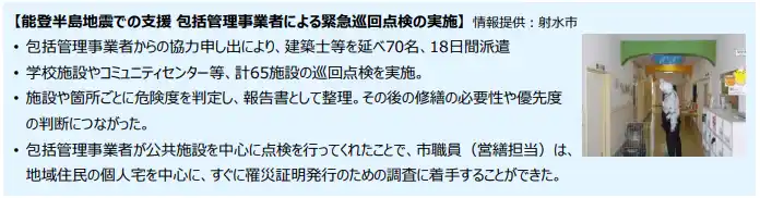 包括管理と民間提案制度を組み合わせることで、職員負担の軽減と財政支出の抑制、さらには脱炭素化や施設価値向上までを一体的に推進している点は高く評価される。能登半島地震時にも有効に機能したという実績は、制度の実効性と強靭性を示すものである。 |