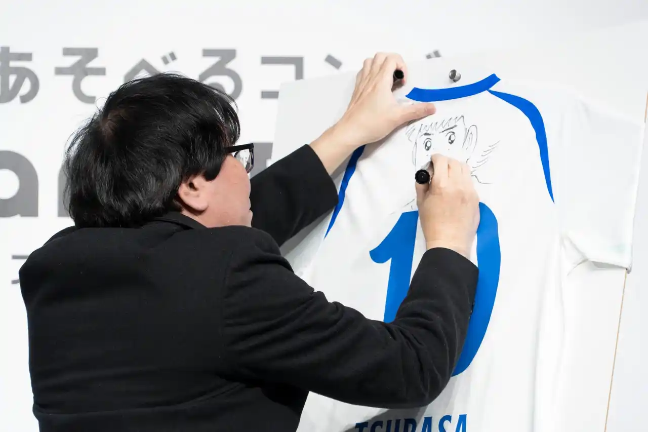 高橋先生には、南葛SCユニフォームの背中に、大空翼とファミリーマートのロゴの特別バージョンをライブドローイングいただきました。松平健さんはおなじみの「マツケンサンバII」を披露いただき、吉田さん・八木さんとともに会場全体が一体となって盛り上がりました。 |