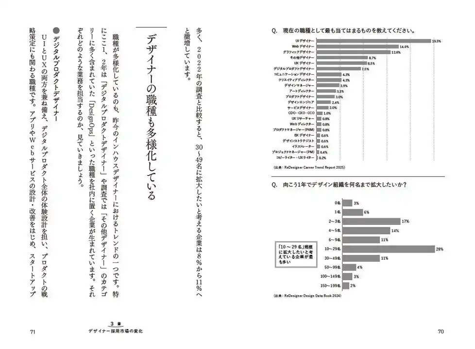 「デザイン組織を拡大したい」と答えた企業が増加/デザイナーの職種も多様化している/年収1000万円を超えるデザイナーも増加/複数のスキルを併せ持つ職種ほど年収も高い/職種別のデザイナーの採用ニーズ――なぜ採用難度は上がっているのか/インハウスデザイナーと社外デザイナー、役割の違いは |