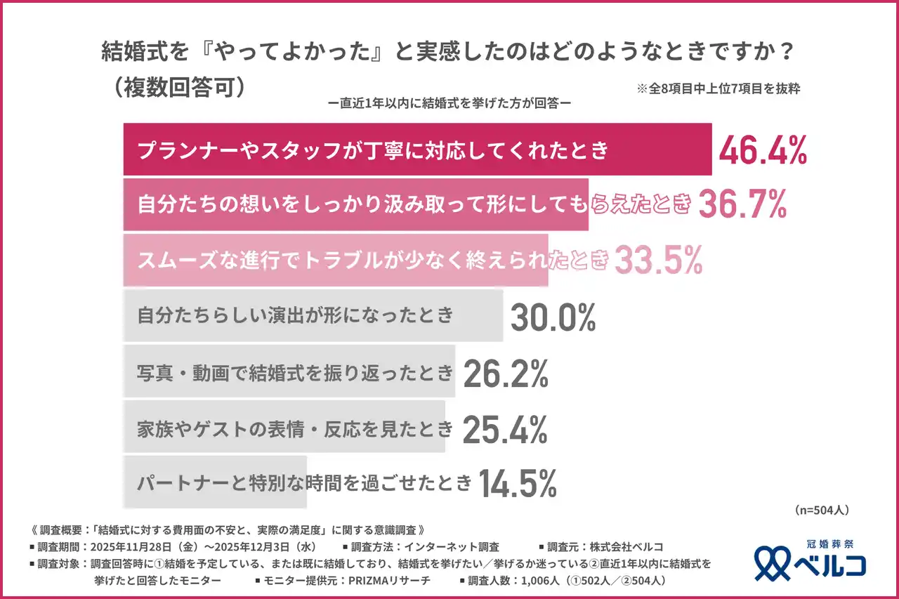 最後に、直近1年以内に結婚式を挙げた方に「結婚式を『やってよかった』と実感したのはどのようなときか」と尋ねたところ、『プランナーやスタッフが丁寧に対応してくれたとき(46.4%)』『自分たちの想いをしっかり汲み取って形にしてもらえたとき(36.7%)』『スムーズな進行でトラブルが少なく終えられたとき(33.5%)』などが上位に挙がりました。 |