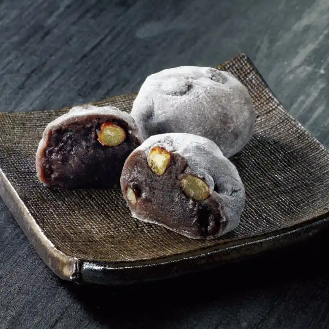赤えんどう豆を混ぜ込んだ黒いもち生地で、ごまあんを包んだミニ大福。やさしい甘さと香ばしい風味が特長です。 |