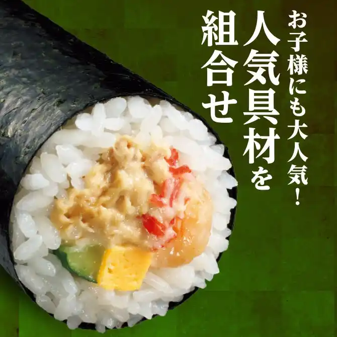 海老マヨネーズ和えとツナマヨネーズ和えの人気具材の他に、厚焼き玉子、カニカマ、胡瓜を組み合わせた、お子様にも大人気のロングセラー商品です。 |