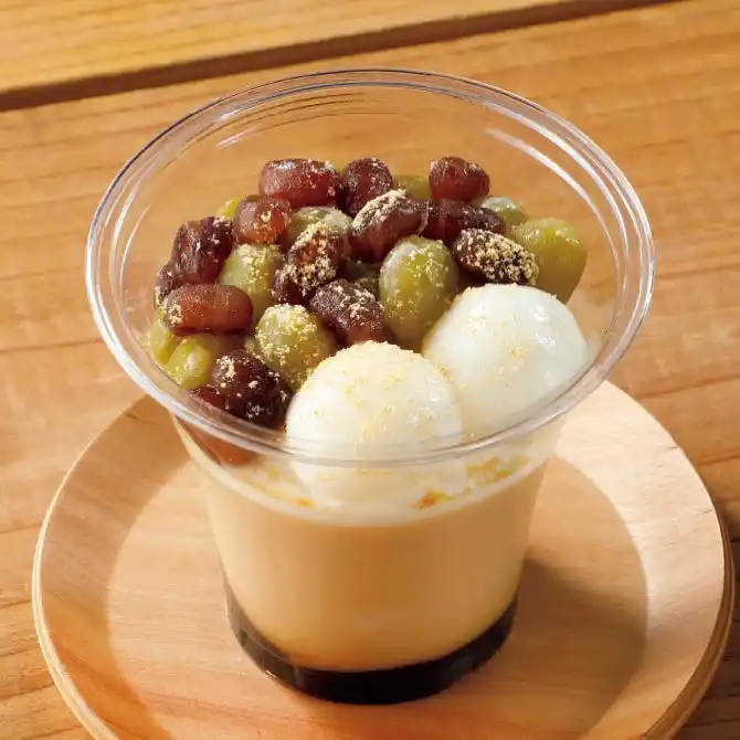 黒蜜ソースともっちり食感のきなこプリンの上に、ホイップクリーム、お団子、うぐいす豆とかのこ小豆を盛り付けました。上品な甘さとコク深い余韻を楽しめる和スイーツです。 |