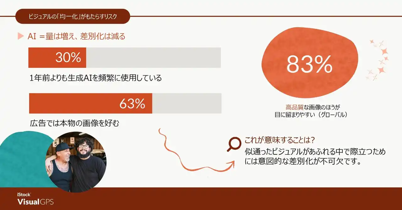生成AIツールの進化により、コンテンツ制作はかつてないスピードで加速しています。その一方で、ブランド規模を問わず「いかにして他と差別化するか」が大きな課題となっており、ビジュアル戦略の重要性はこれまで以上に高まっています。iStockのビジュアル調査「VisualGPS」によると、現在10人中6人が広告を信頼していないと回答しており、その主な理由として「AI生成」「加工されすぎている」「不自然で本物らしくない」と感じていることが挙げられています。