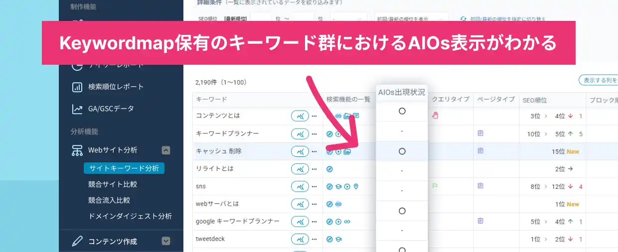 Keywordmapが保有するキーワード群に対して、AIOsが表示されているかどうかを確認できるようになりました。 |