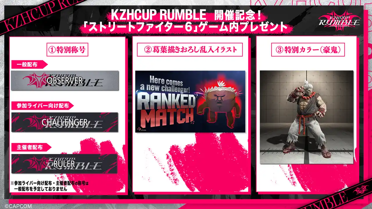 | 「KZHCUP RUMBLE in STREET FIGHTER 6」の開催を記念して、カプコン「ストリートファイター6」ゲーム内で使用できる「記念称号」「葛葉描きおろし乱入イラスト」「特別カラー(豪鬼)」をプレゼントとしてご用意しております。 | |||||