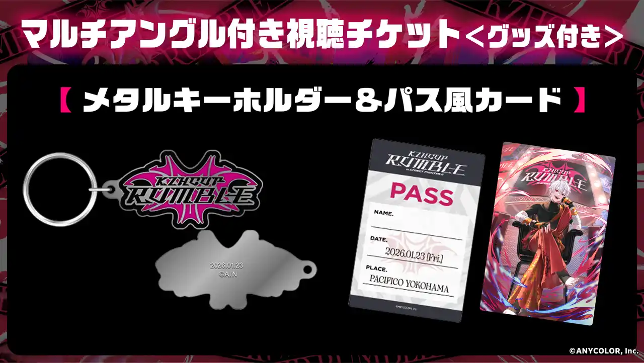 | アーカイブ配信は「マルチアングル付き視聴チケット」でのみ視聴可能で、メタルキーホルダーとパス風カードが付属する、グッズ付きチケットも販売いたします。 | |||||