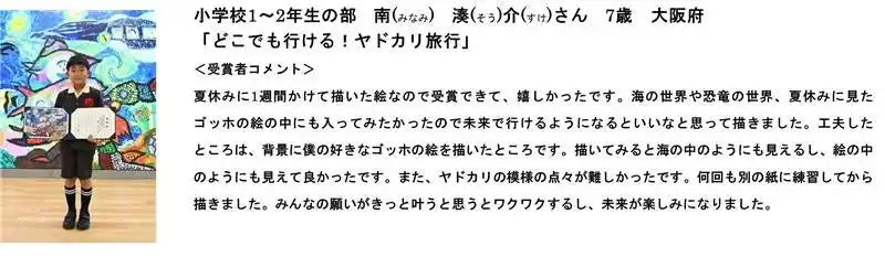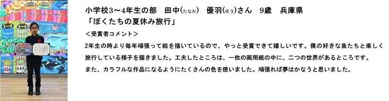 また、審査員からは、「自分の日々の生活を起点に制作された作品や、応募者みなさんの頭の中で描く創造的な夢の世界を描いた作品を多く拝見し、審査員一同、パワーを受け取りました」とコメントをいただきました。 |
