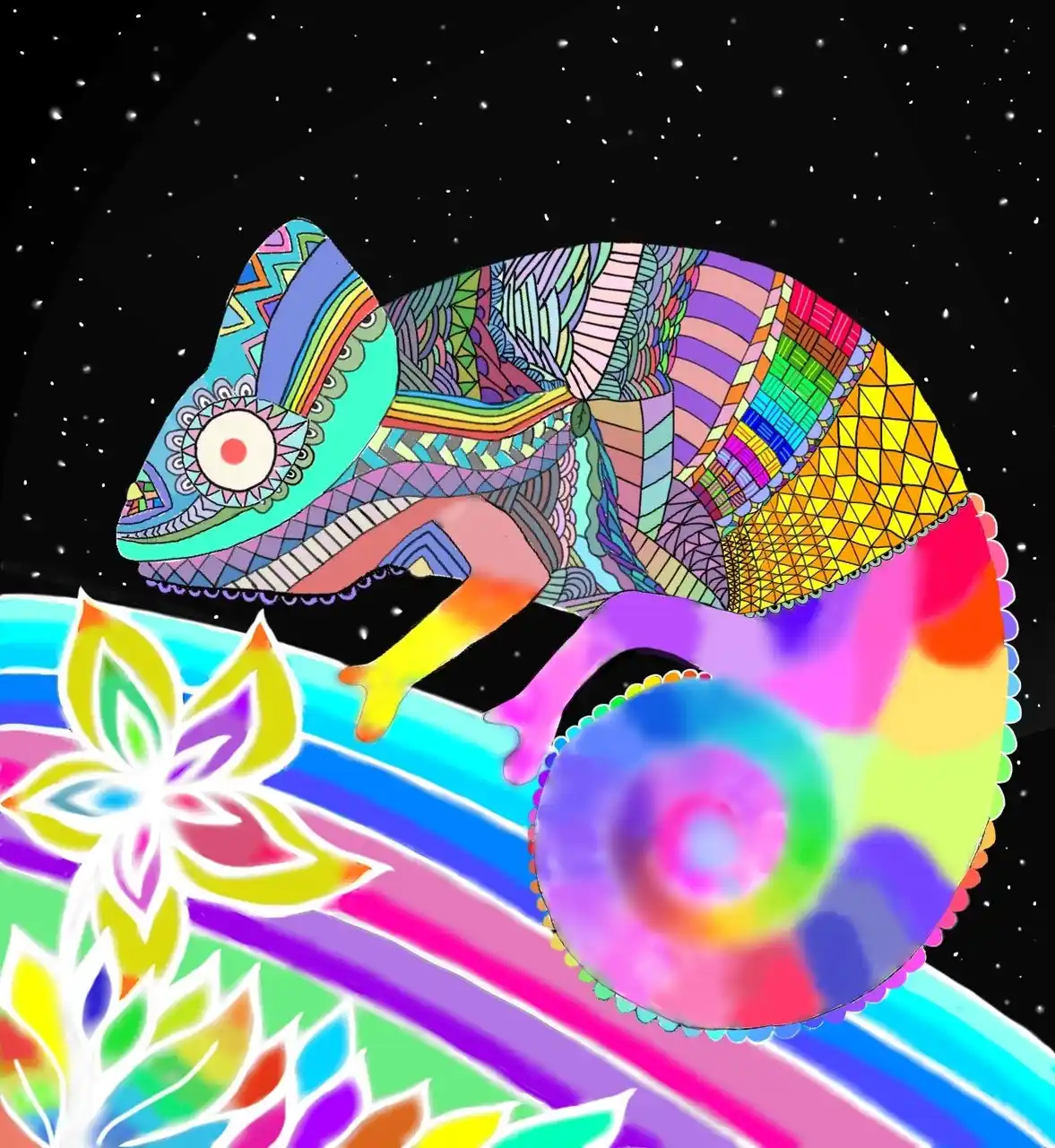 孤独から抜け出し世界で混ざり合う様子を多様性と言う意味のカメレオンや背景を使って表現した。今は、国や地域、性、宗教で明確な区切りがあるが、未来になるにつれ人々が共存していってほしいという願いを込めた。 |