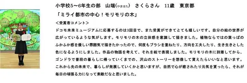 株式会社NTTドコモ(以下、ドコモ)は、日本最大級※1の創作絵画コンクール「第24回ドコモ未来ミュージアム」およびプログラミングコンテスト「第3回ドコモ未来ラボ」の表彰式を2025年12月20日(土)に開催し、厳正な審査を経てそれぞれの受賞作品が決定しました。 |