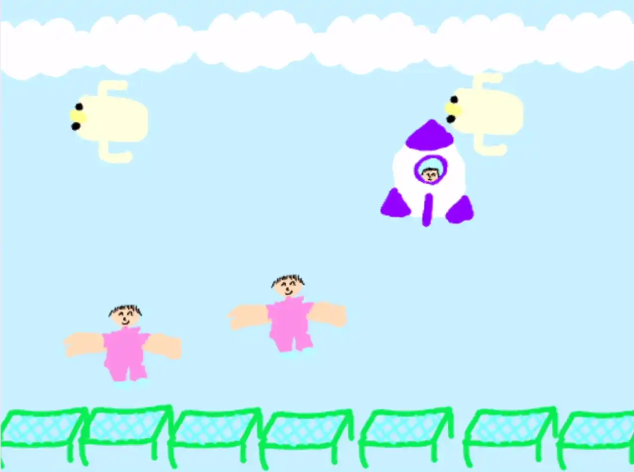 作品説明:はねロケットは、トランポリンでポヨンポヨン!ととびはね、世界中へひとっとびできる未来ののりものです。燃料を使わないので、地球にやさしいです。なかよしのお友達がアメリカに引っ越してしまったので、「すぐに会いたい!」と思って、この作品を考えました。プログラミングでは、ロケットをじょうずにとばせるように頑張りました。ふわふわの雲も使い、何回もやり直して、うまくとばせるようになりました。 |